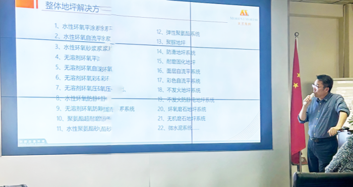 在主题分享环节,美圣雅恒地坪事业部业务拓展经理 鞠延斌先生就地坪产品及系统解决方案做了全