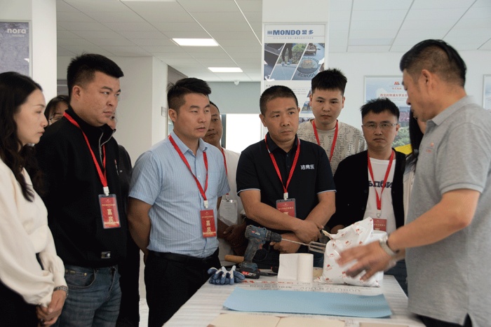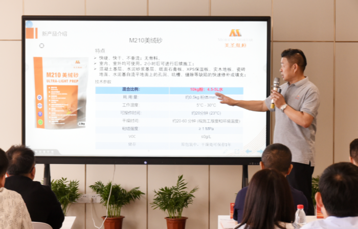 美圣雅恒市场部产品经理李昌木先生为大家带来了弹性地材新产品及地坪系统的详细讲解,并进行现
