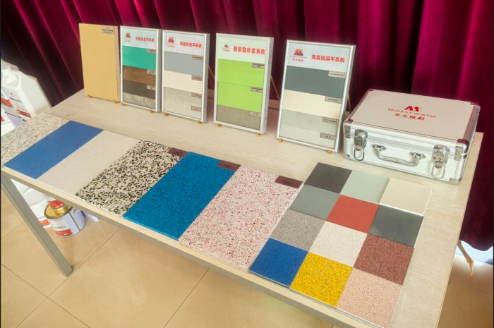 性与实际效果。本次实操产品包括:M210美绒砂、彩色面层自流平、环氧彩砂自流平。